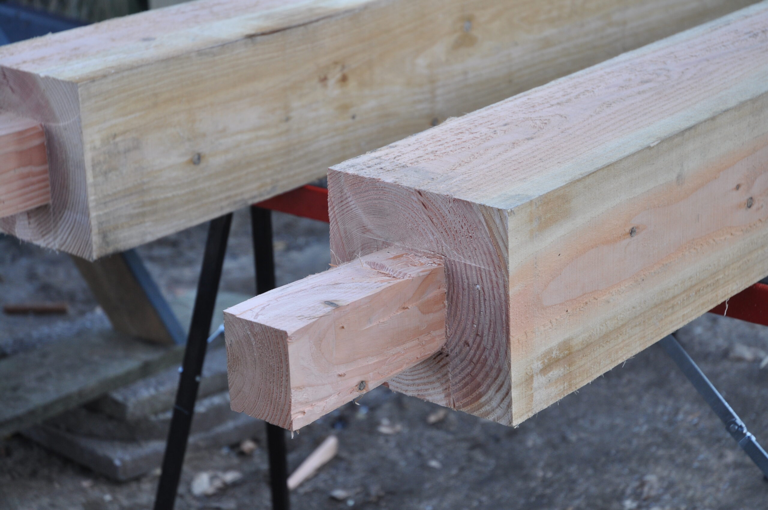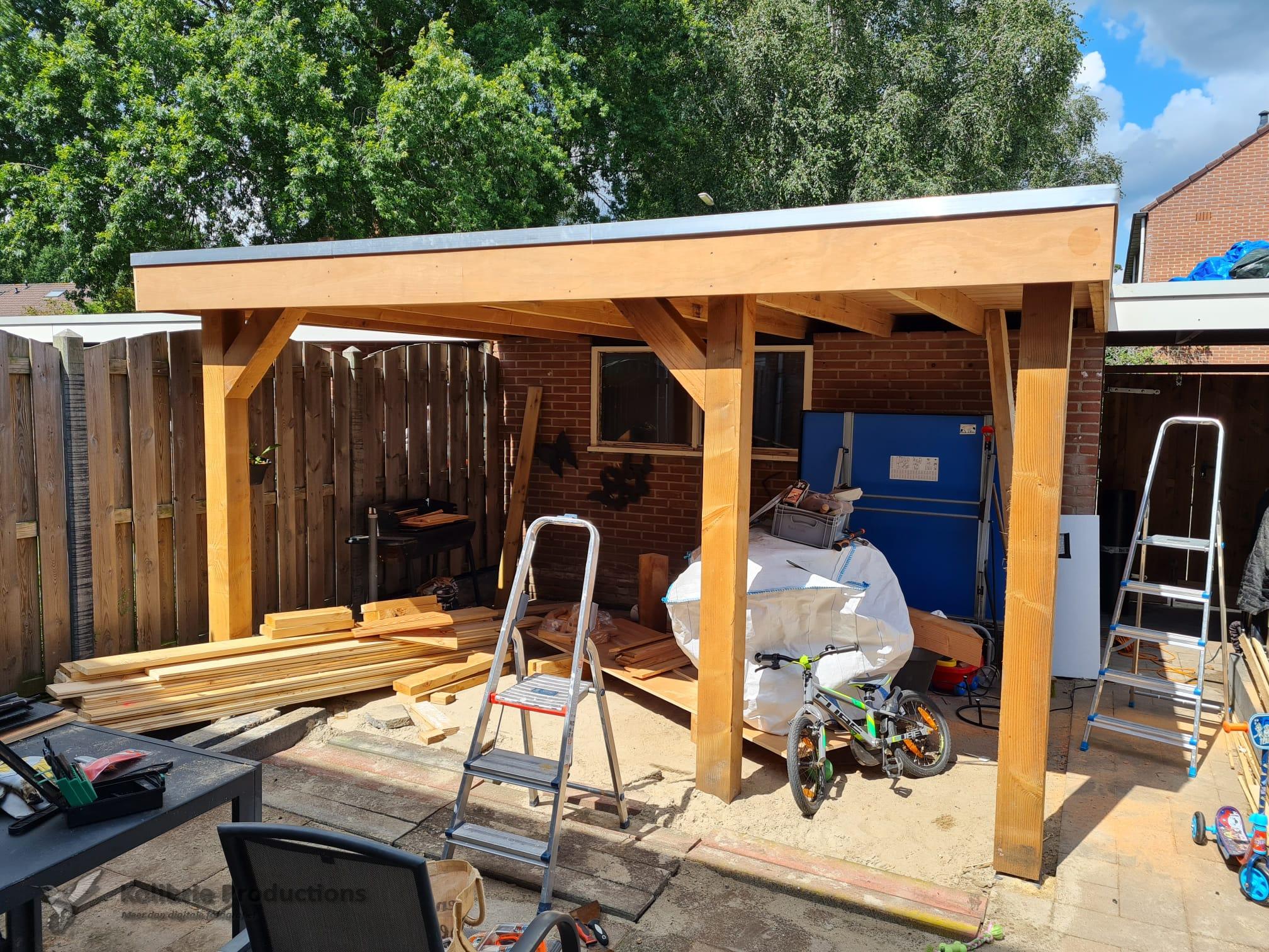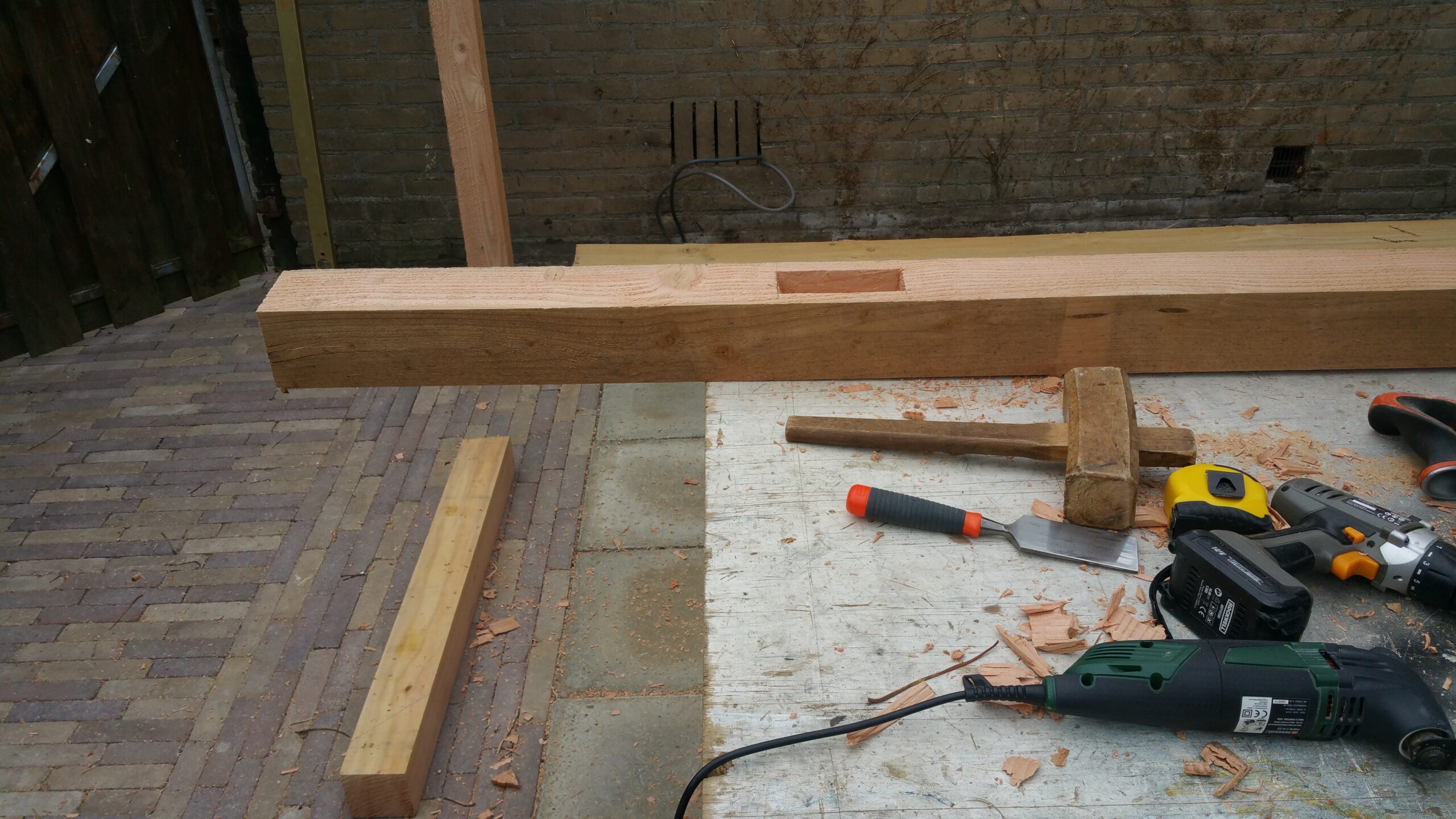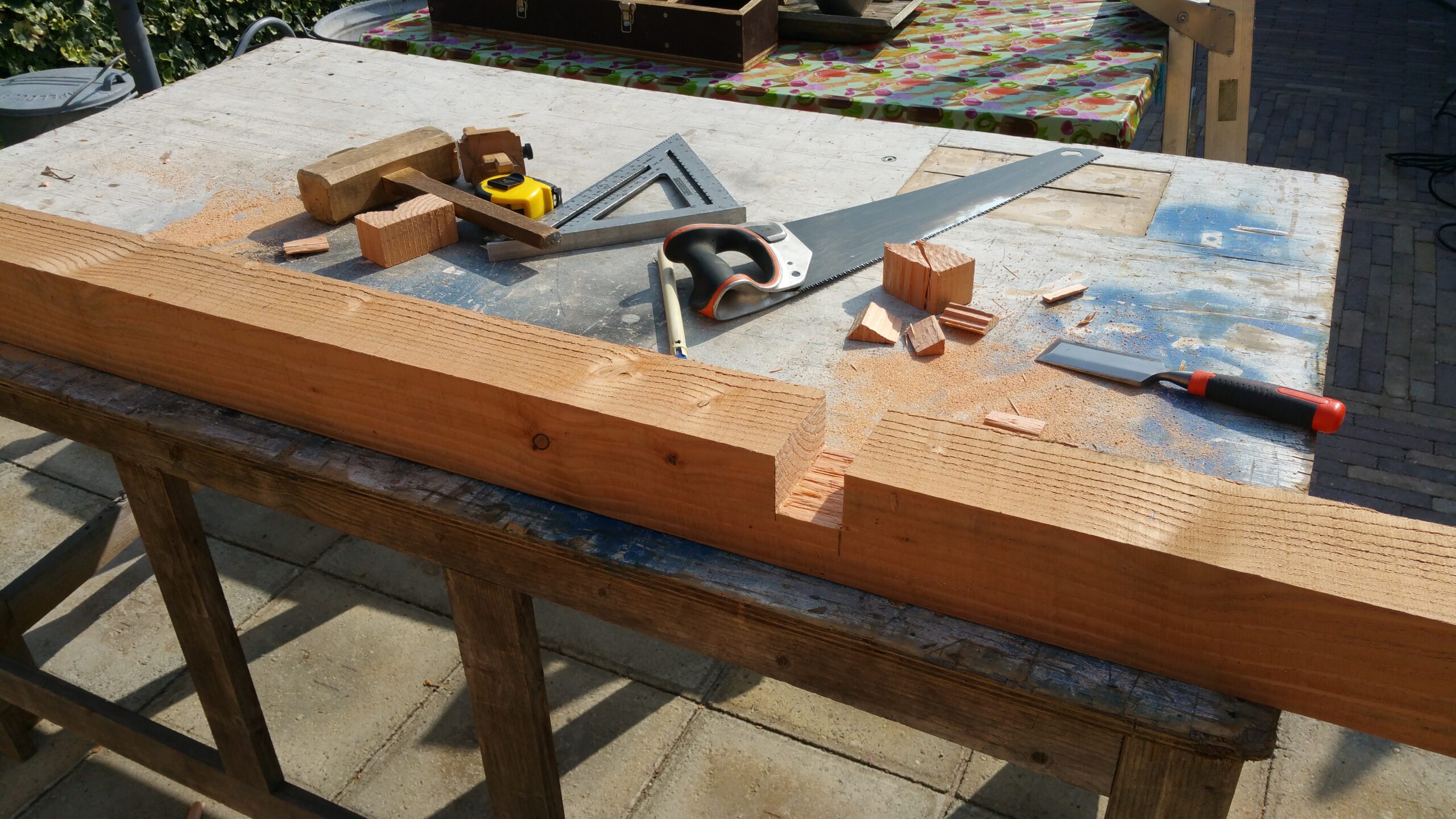 De grootste uitdaging die ik heb gemaakt! De loungeruimte is een opdracht van een bekende van mij. De afmeting is 12m bij 4m, waarvan 8m loungeruimte en 4m opslagruimte. Gemaakt van fijn gezaagd, niet gedroogd,  lariks hout. Na het nodige meet- en rekenwerk werd het hout besteld en geleverd op het werk adres. Een complete oplegger vol met balken, planken en andere onderdelen. Alles is met de hand bewerkt: met hamer, beitel, handzaag en ander gereedschap. Het geraamte bestaat uit balken van 200mm*200mm in diverse lengtes. In het geraamte komen geen spijkers voor, alles is gemaakt met pen/gat verbindingen. Het was een grote klus en een hele uitdaging om te doen.
