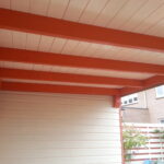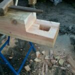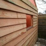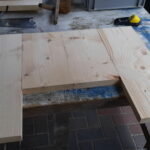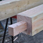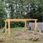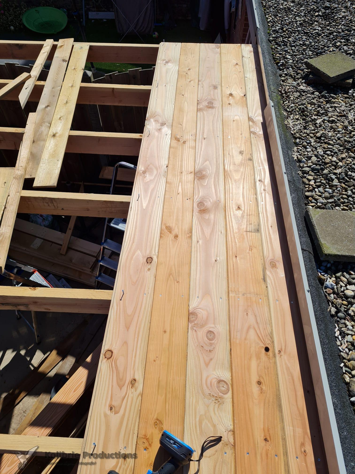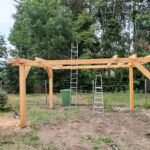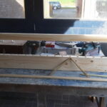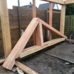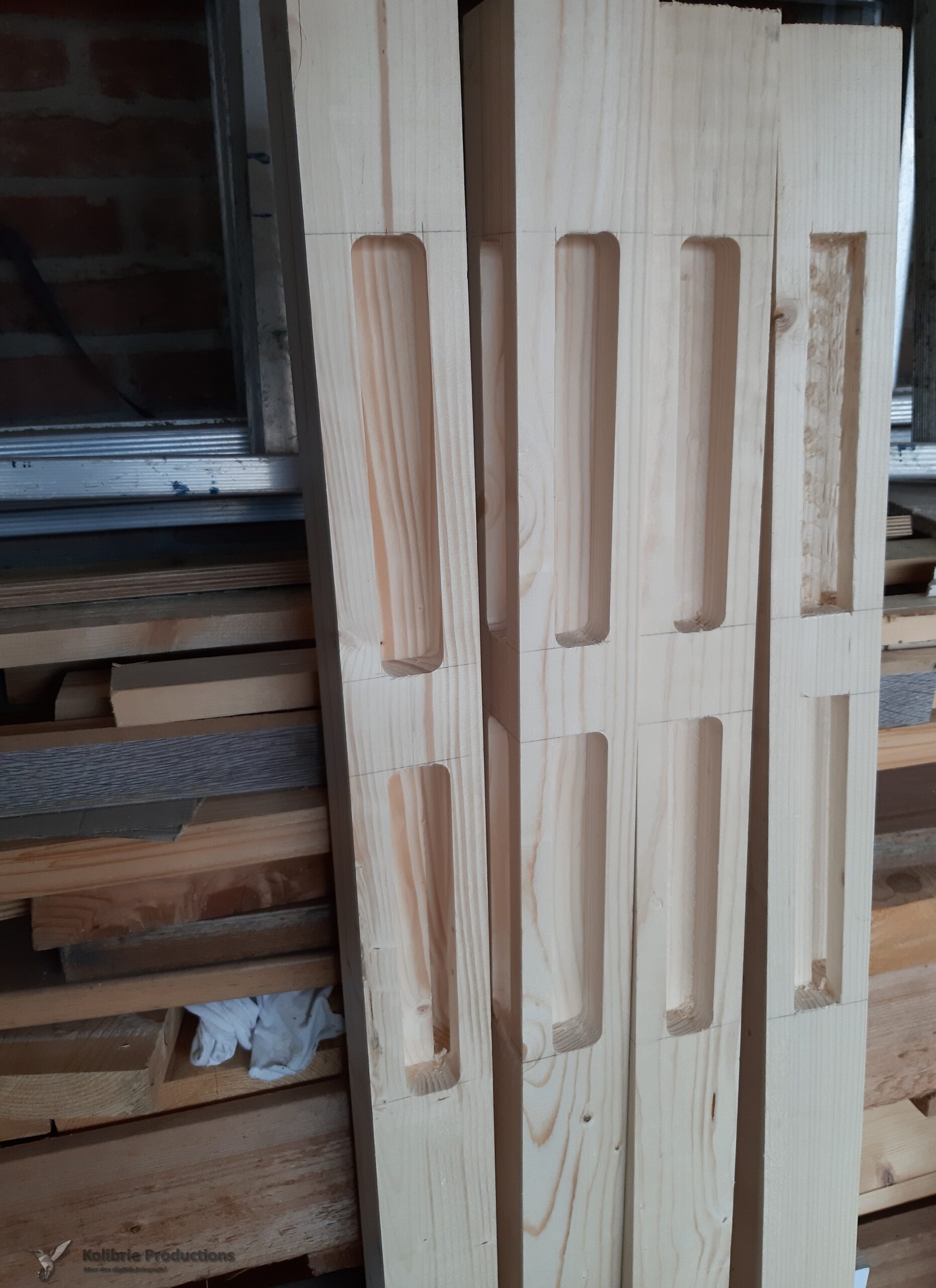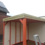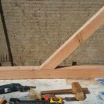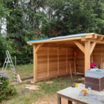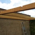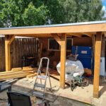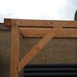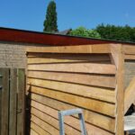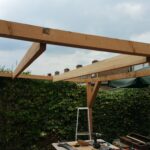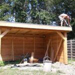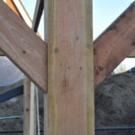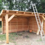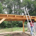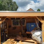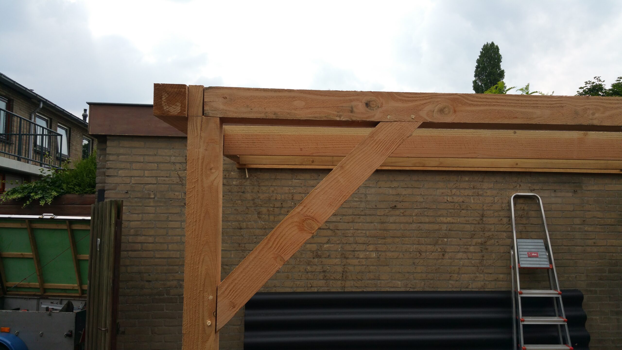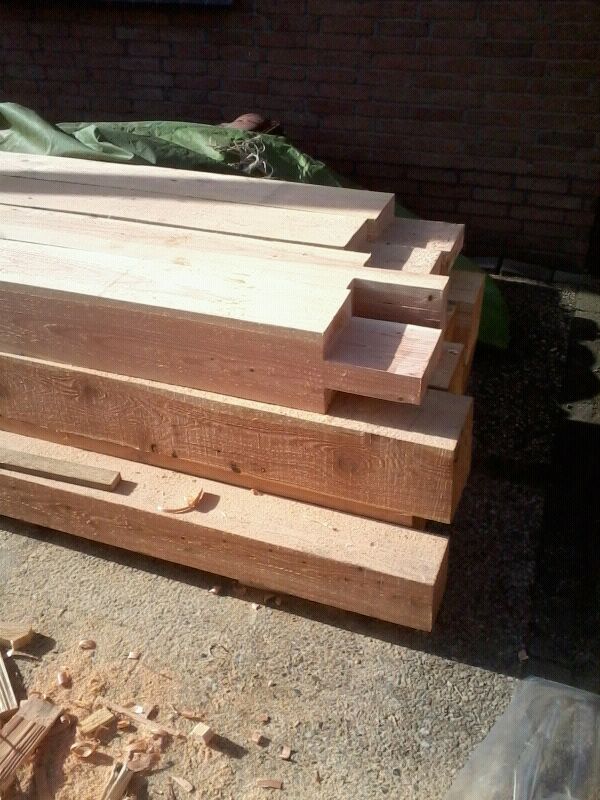 De grootste uitdaging die ik heb gemaakt! De loungeruimte is een opdracht van een bekende van mij. De afmeting is 12m bij 4m, waarvan 8m loungeruimte en 4m opslagruimte. Gemaakt van fijn gezaagd, niet gedroogd,  lariks hout. Na het nodige meet- en rekenwerk werd het hout besteld en geleverd op het werk adres. Een complete oplegger vol met balken, planken en andere onderdelen. Alles is met de hand bewerkt: met hamer, beitel, handzaag en ander gereedschap. Het geraamte bestaat uit balken van 200mm*200mm in diverse lengtes. In het geraamte komen geen spijkers voor, alles is gemaakt met pen/gat verbindingen. Het was een grote klus en een hele uitdaging om te doen.