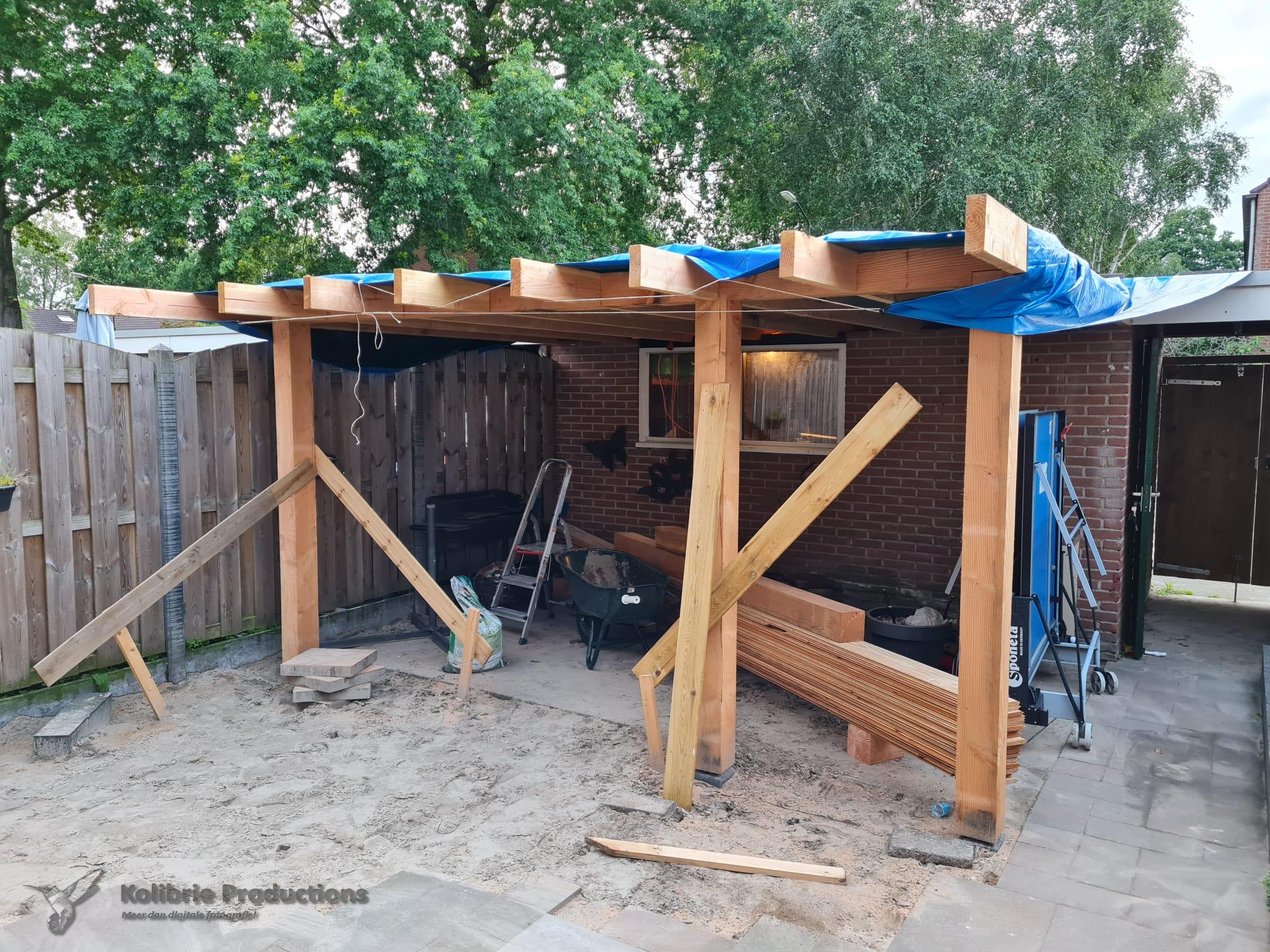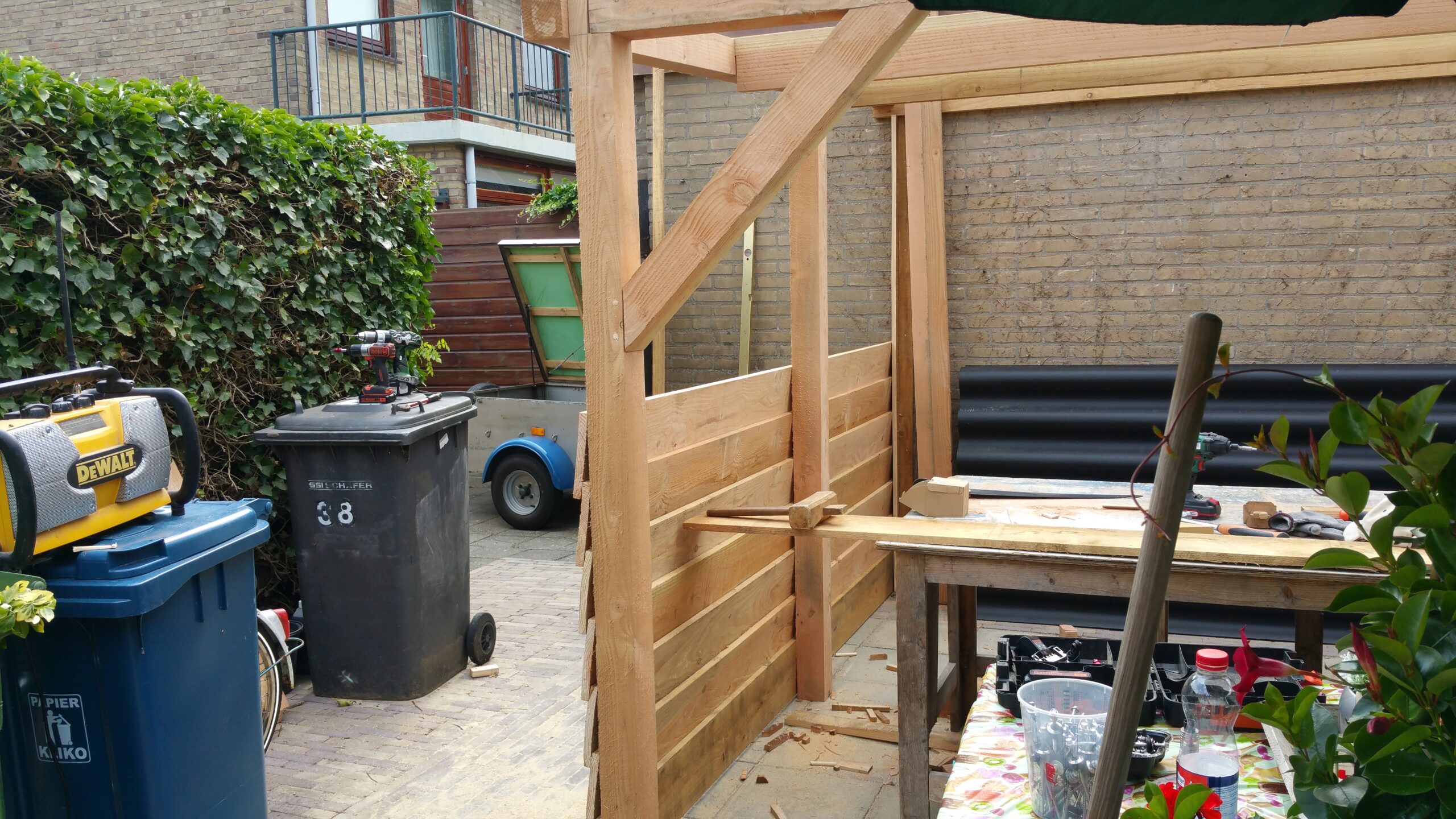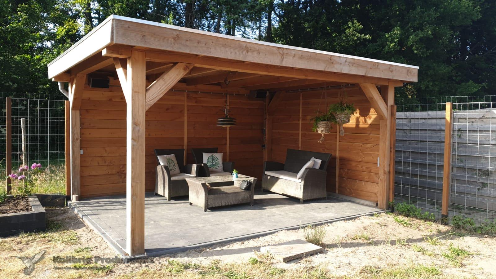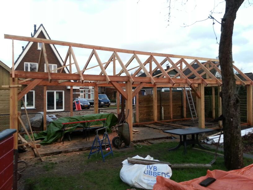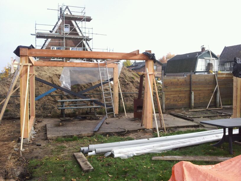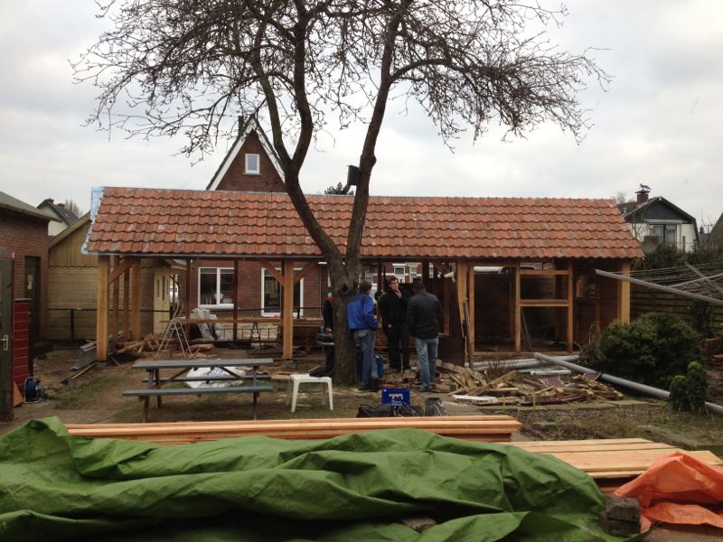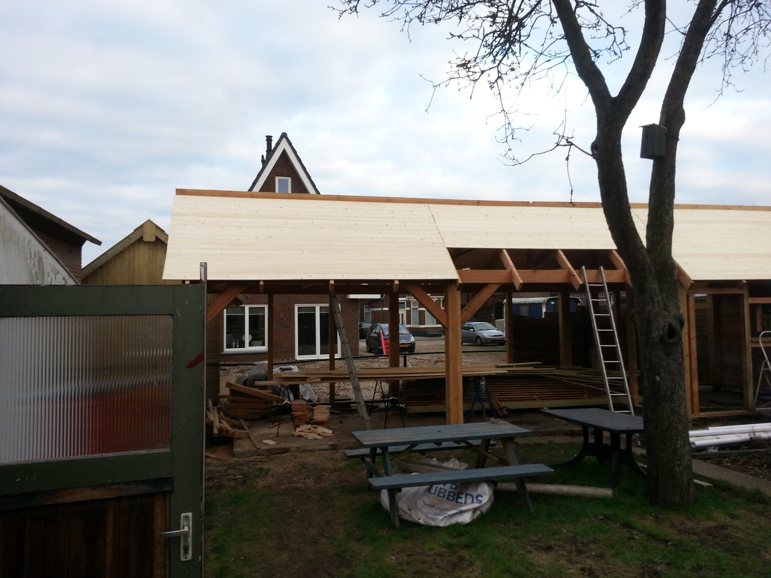 Deze ontspanningsruimte is in opdracht van Rein en Anneke gebouwd achter hun huis.  Ook deze is geheel gebouwd met pen gat verbindingen en hierin komen, in het geraamte, weinig tot geen schroeven en spijkers aan te pas.