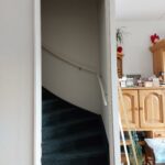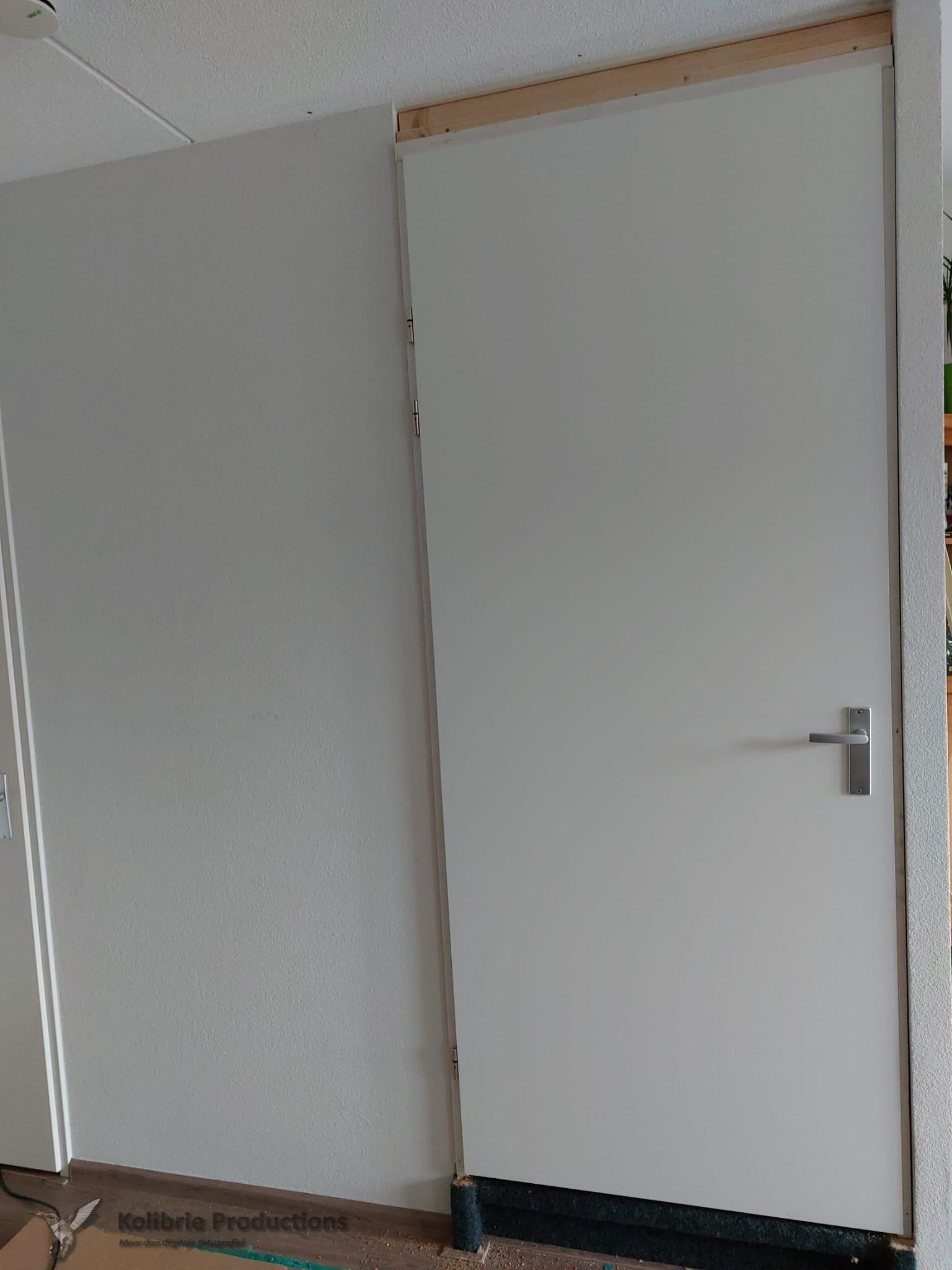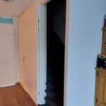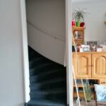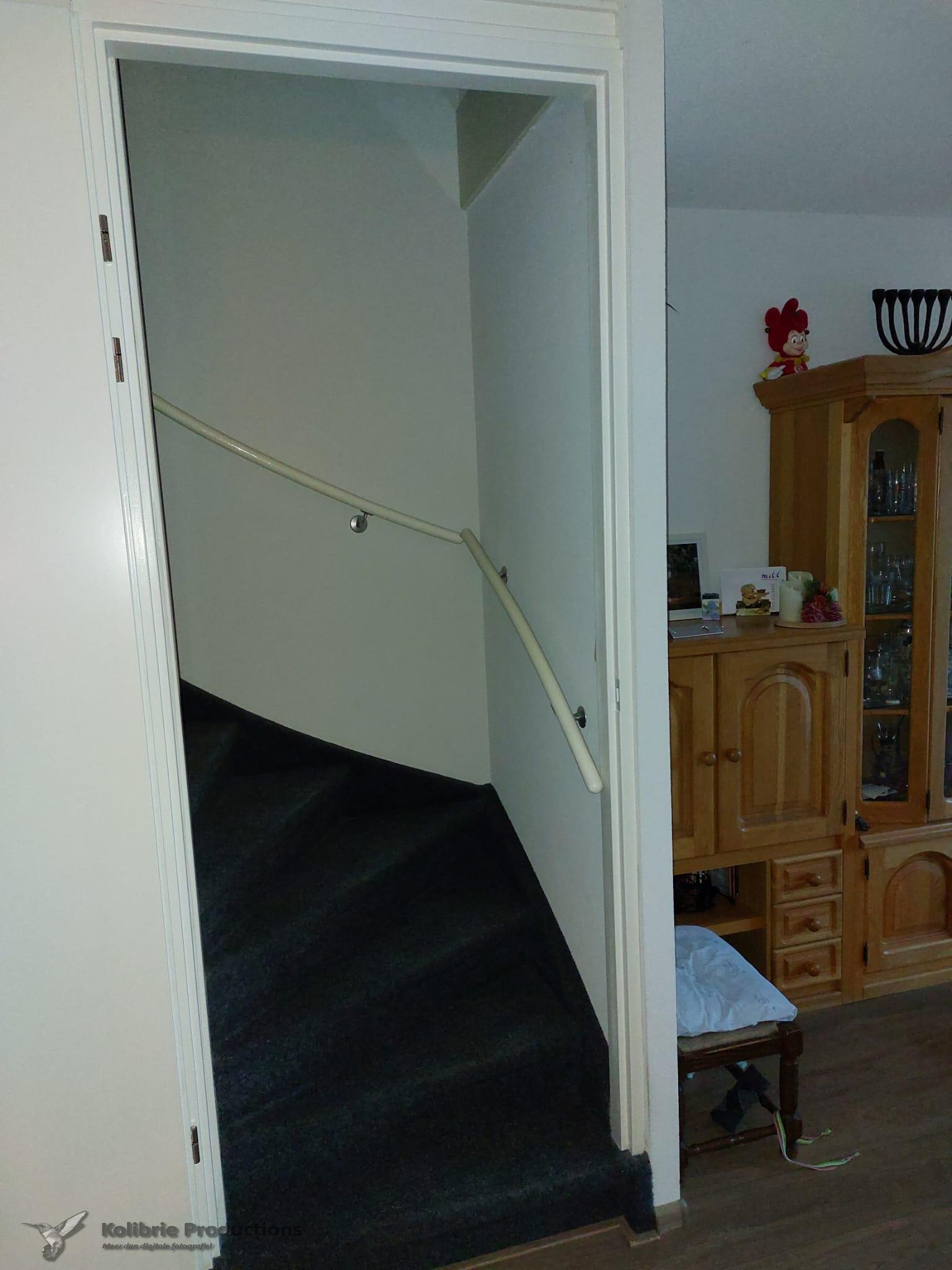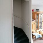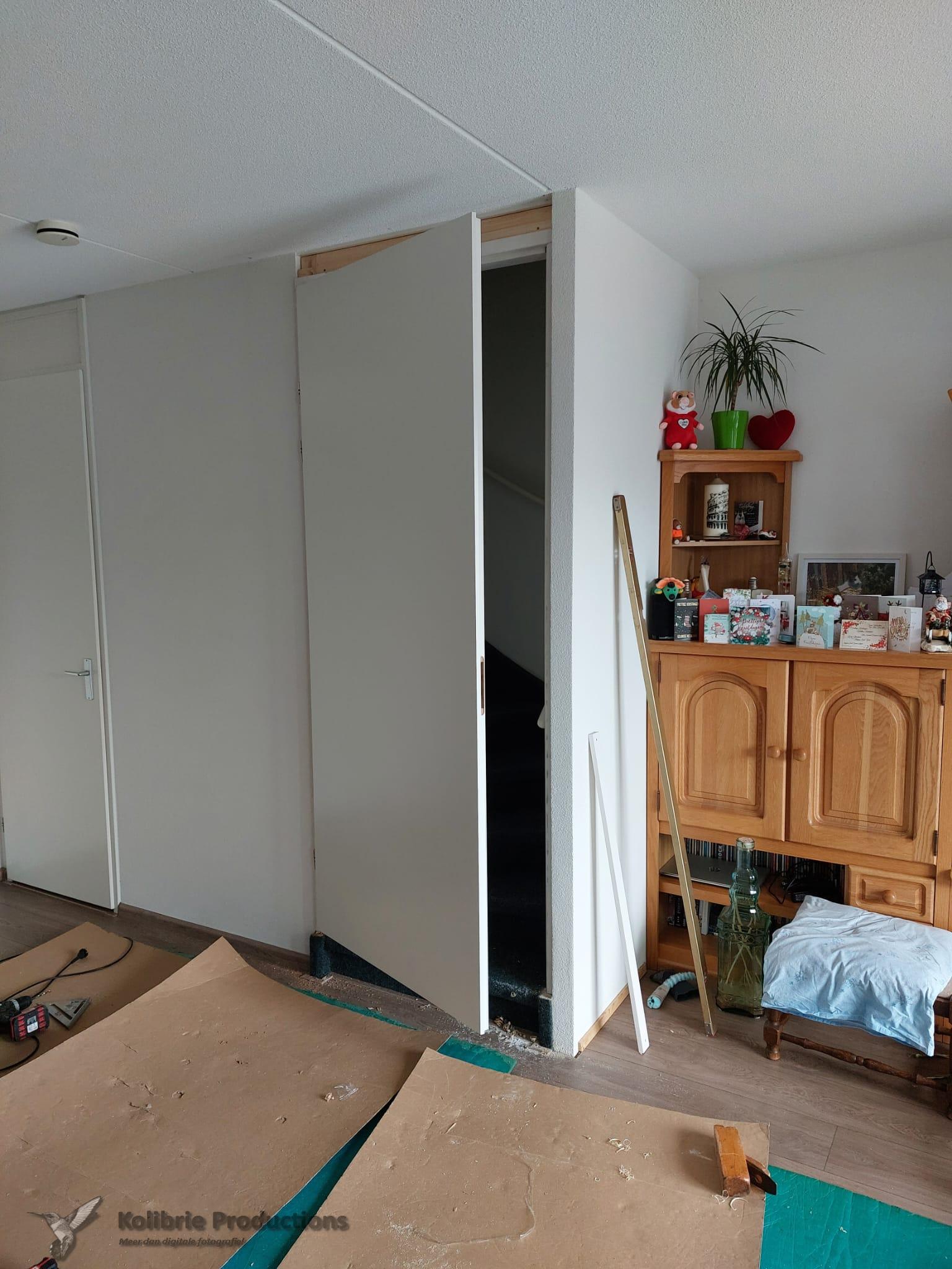 In deze woonkamer is ook de trapopgang naar boven. De bewoners hadden hier een gordijn voor hangen om de warmte niet direct naar boven te laten gaan. Nu wilde men er graag een deur voor hebben, dat kan gerealiseerd worden en dat is dus ook gedaan.