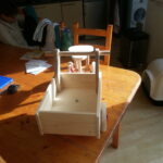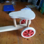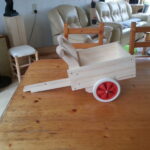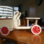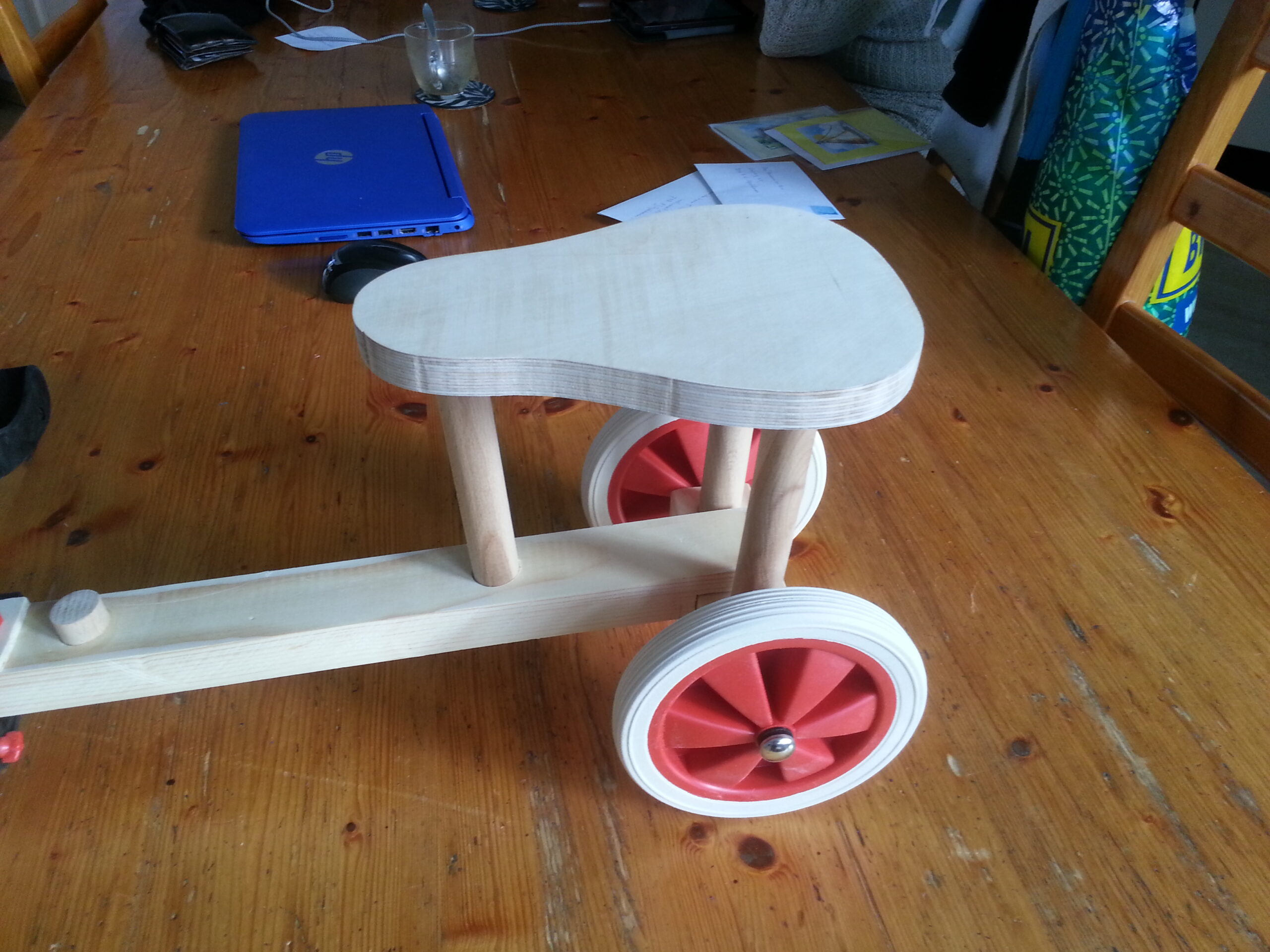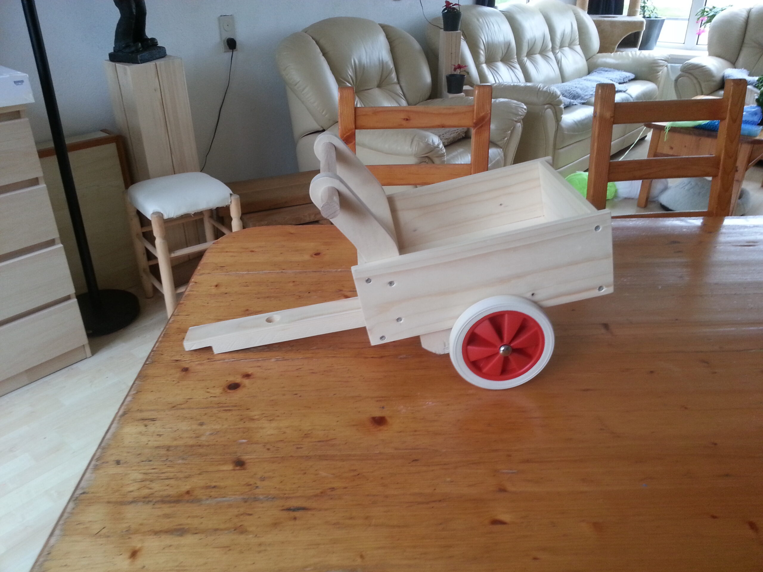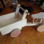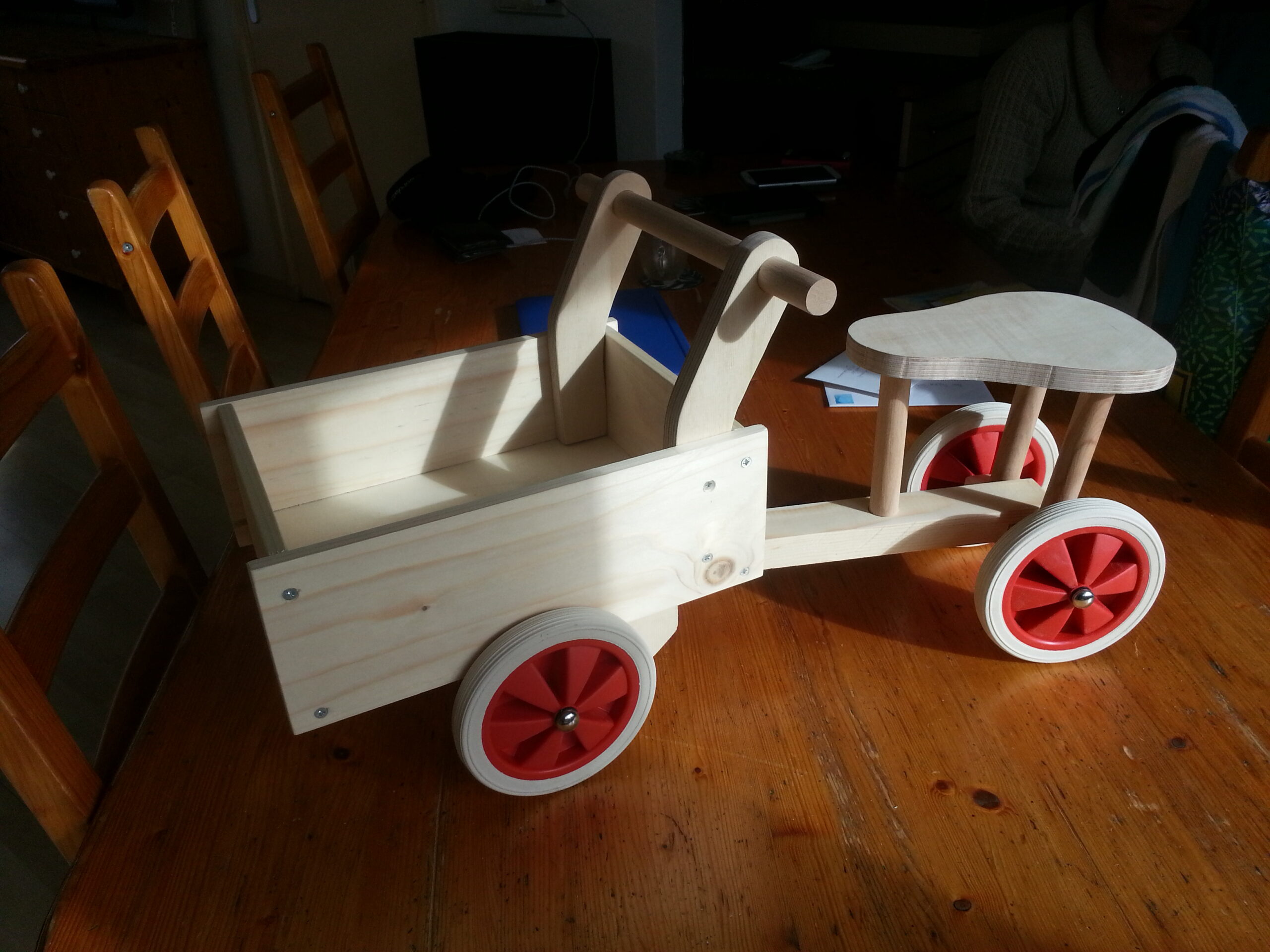 De totstandkoming van deze kinderbakfiets is, een bericht van mijn 2de zoon en vrouw. Zij lieten ons, doormiddel van een cadeautje, merken dat we opa en oma werden! Dan ga je als klussende Opa op zoek naar een leuke gift en dat was de kinderbakfiets geworden. Niet kort daarna kwam ook onze 1ste zoon zijn vriendin met een zelfde verrassing! Tja, Opa, dan moet je er dus twee maken. Ik heb er meerdere gemaakt een met mooie rode wielen (zeg maar, de GT uitvoering) en één met houten wielen (de standaard uitvoering).